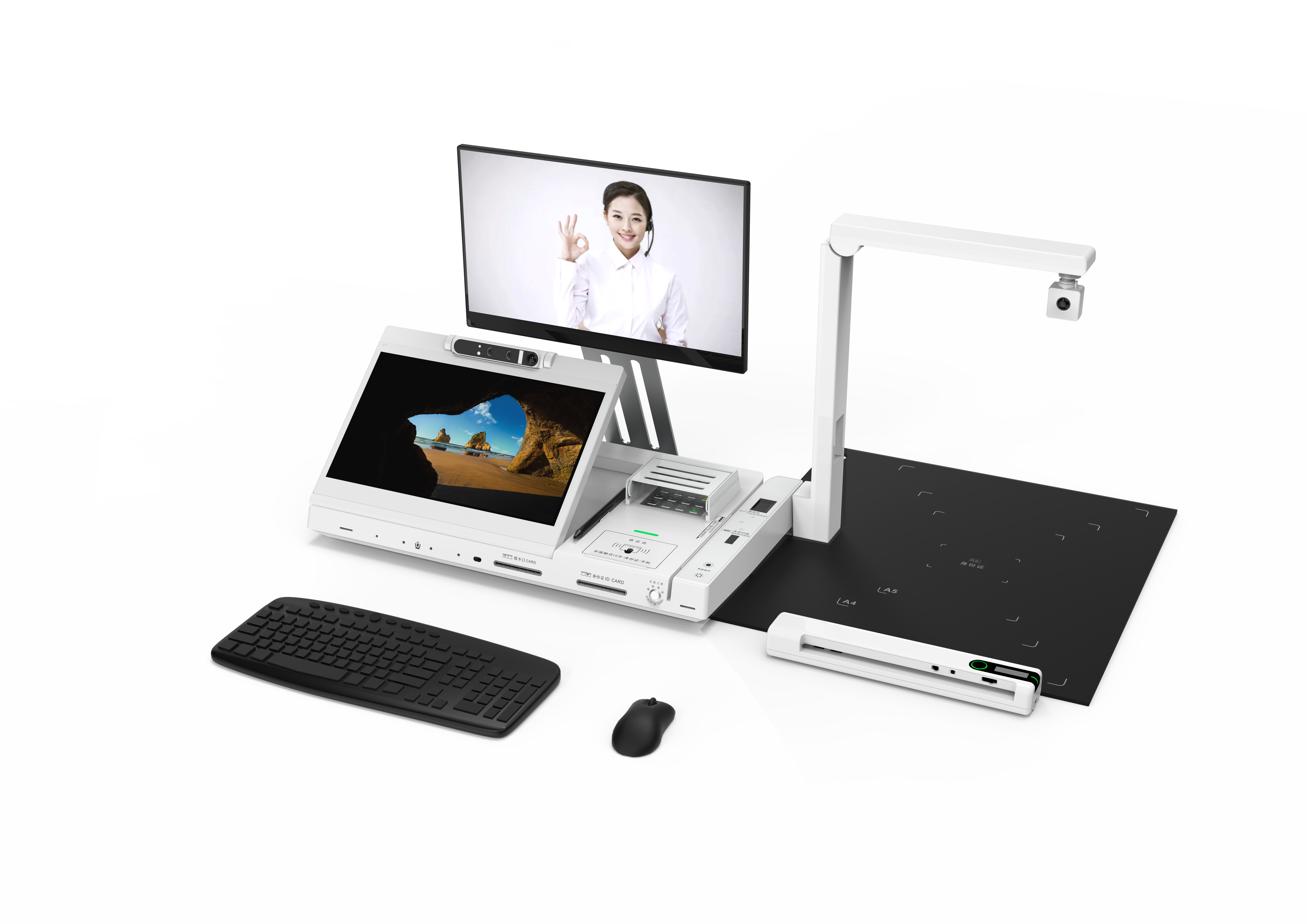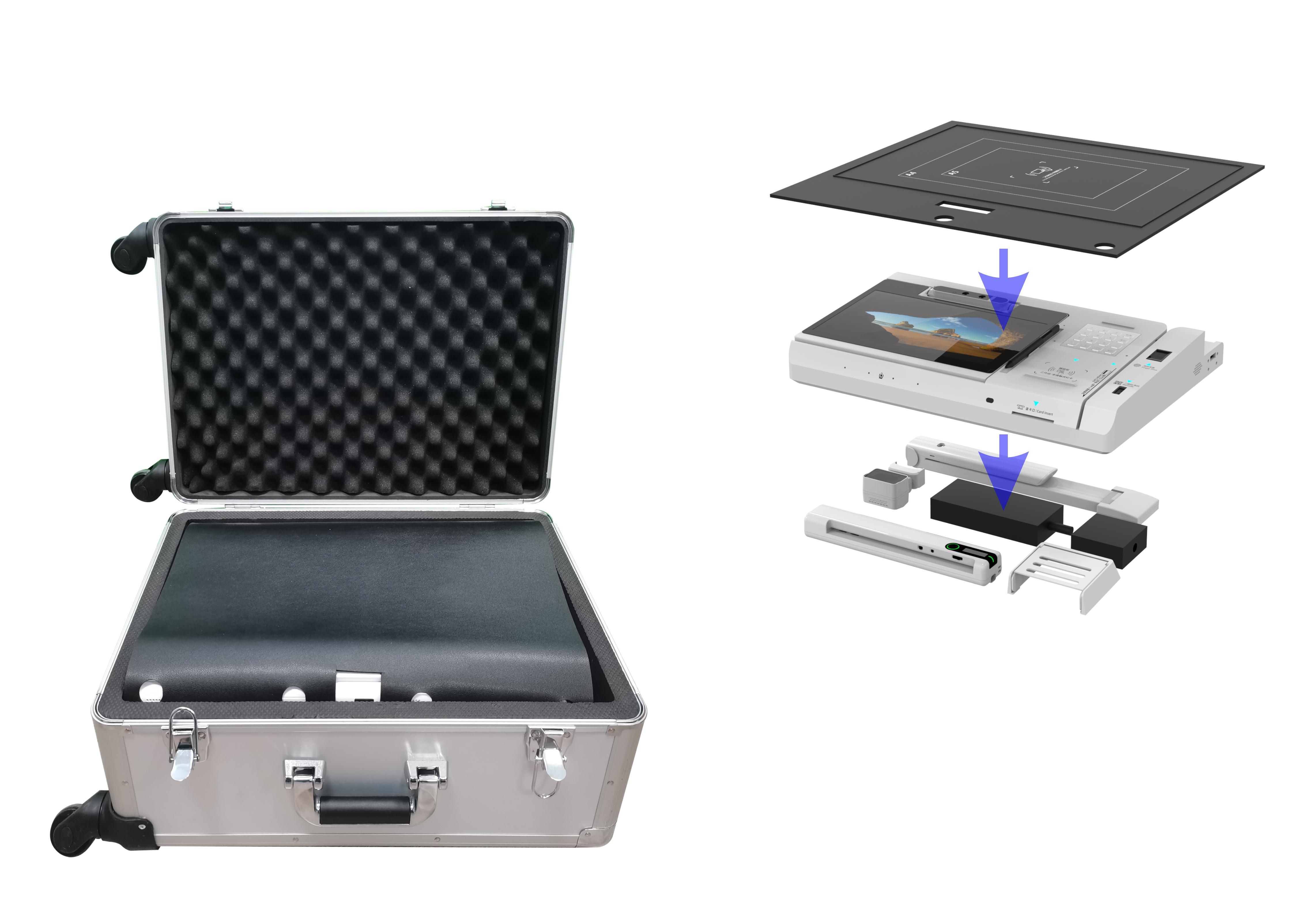 The Mobile Luggage device launched by GEIT integrates "intelligent counter services + full-process operations + one-stop services" in one unit. It incorporates modules such as bank terminals, external counter terminals, internal counter terminals, and high-speed document scanners, featuring seamless access capability with a mature and reliable system adaptation. With a concise and elegant appearance, it adopts a laptop-like design—compact in size and equipped with a standard pull rod case—making it suitable for on-site outreach scenarios. The entire device boasts exquisite craftsmanship, ergonomic design, rational layout, and comfortable operation.