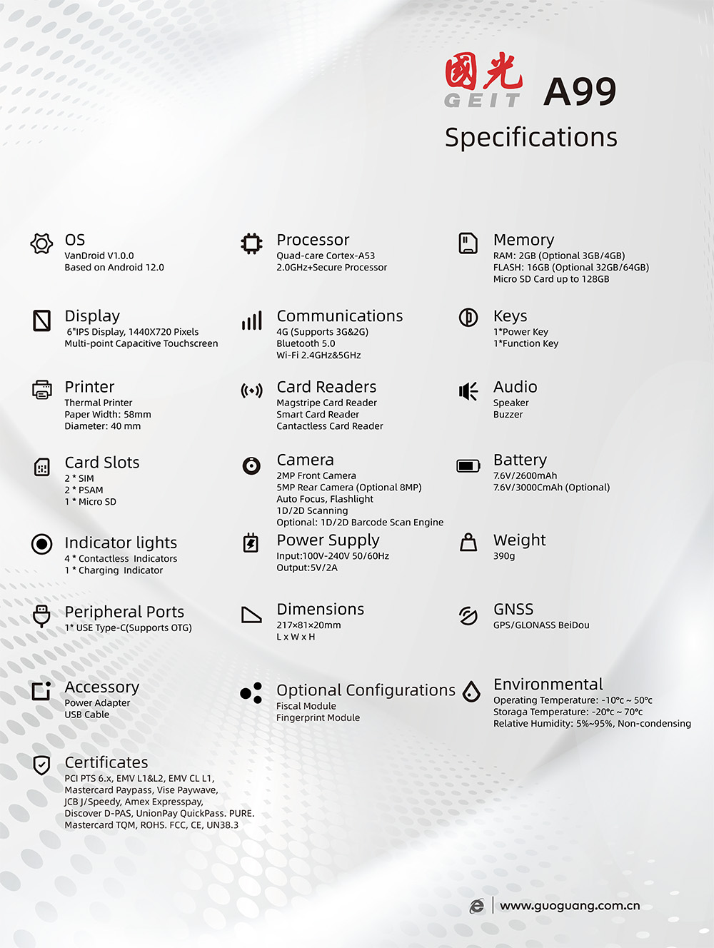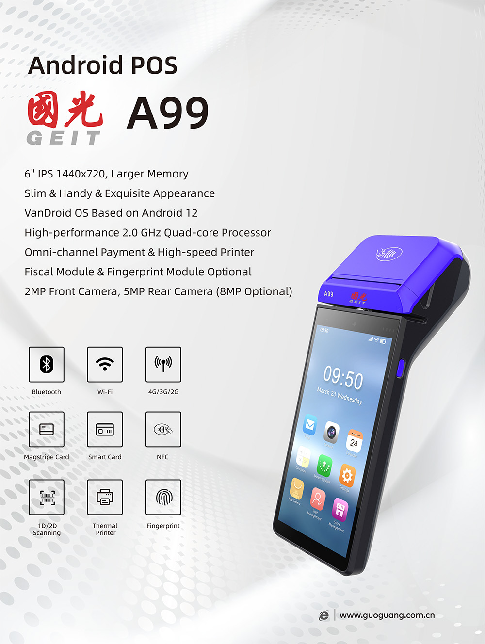 6"IPS 1440x720,Larger MemorySlim &Handy &Exquisite AppearanceVanDroid OS Based on Android 12High-performance 2.0 GHz Quad-core ProcessorOmni-channel Payment &High-speed PrinterFiscal Module &Fingerprint Module Optional2MP Front Camera,5MP Rear Camera (8MP Optional)