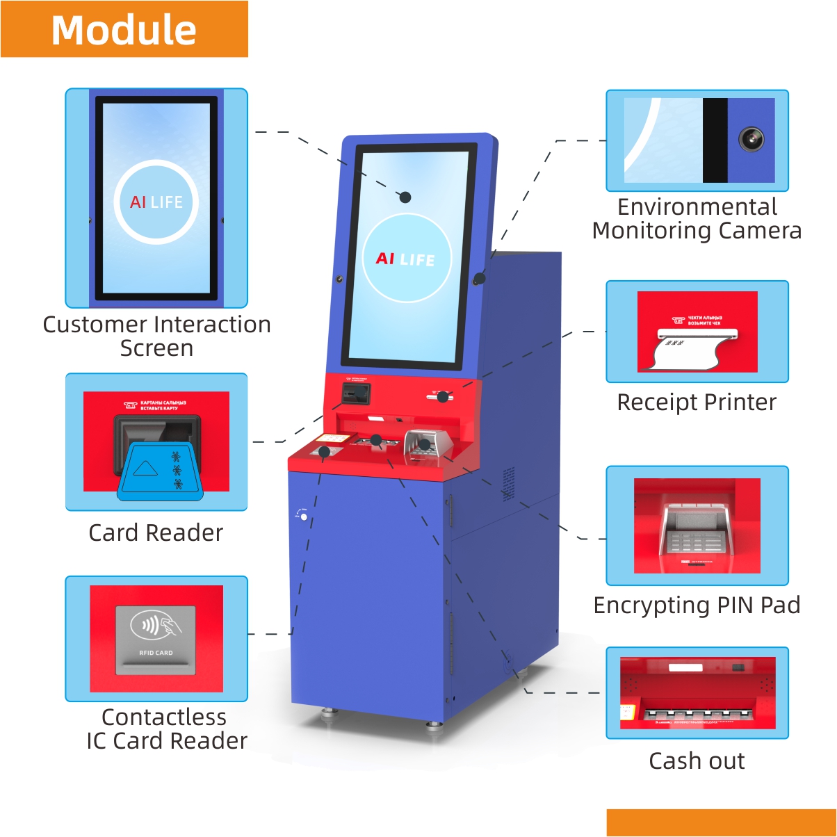 Premier Security: Auto cleaning of sundries and foreign objects detection design in cash slot enhance the security of transaction on the machine. Optional security cameras and DVR provide comprehensive transaction monitoring service for bank customer.