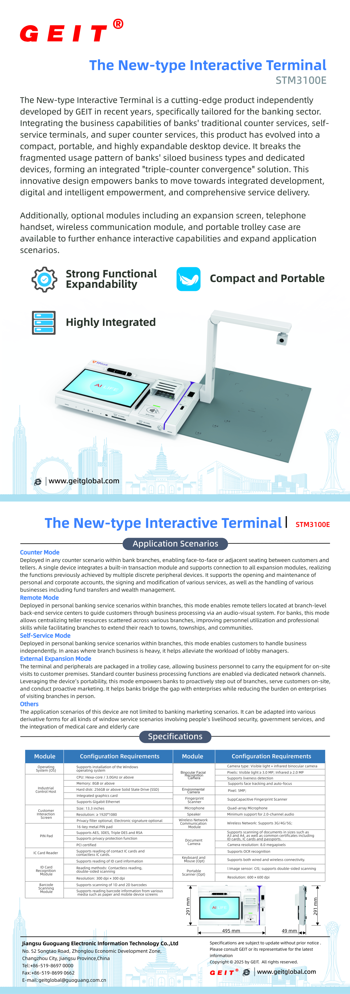 The New-type Interactive Terminal is a cutting-edge product independently developed byGEIT in recent years, specifically tailored for the banking sector. Integrating the business capabilities of banks' traditional counter services, self-service terminals, and super counter services, this product has evolved into a compact, portable, and highly expandable desktop device. It breaks the fragmented usage pattern of banks' siloed business types and dedicated devices, forming an integrated "triple-counter convergence" solution. This innovative design empowers banks to move towards integrated development, digital and intelligent empowerment, and comprehensive service delivery.