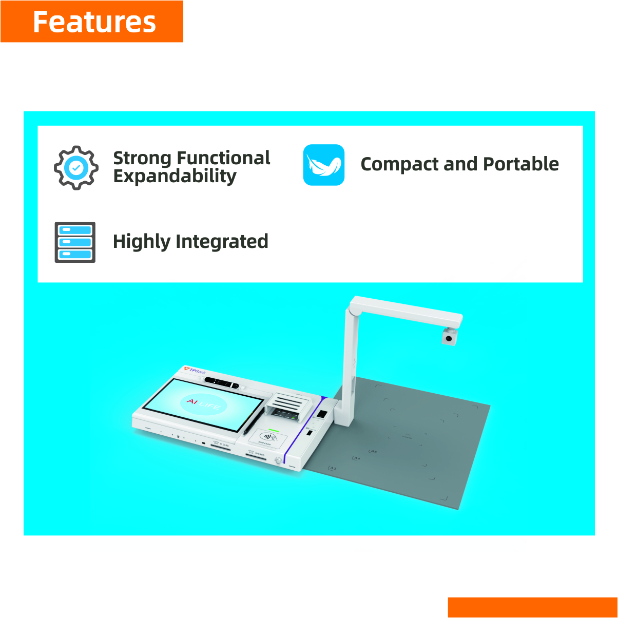 The terminal comprises the following core components: contactless/contact card reader, inhalation-type ID card reader, magnetic stripe read/write module, fingerprint scanner, PIN pad, electronic signature pad, binocular PTZ tracking camera, document camera, barcode scanning module, and array microphone. It can also connect to specialized peripheral modules such as printers, scanners, card dispensers, and security token dispensers via a docking station. Additionally, optional modules including an expansion screen, telephone handset, wireless communication module, and portable trolley case are available to further enhance interactive capabilities and expand application scenarios.