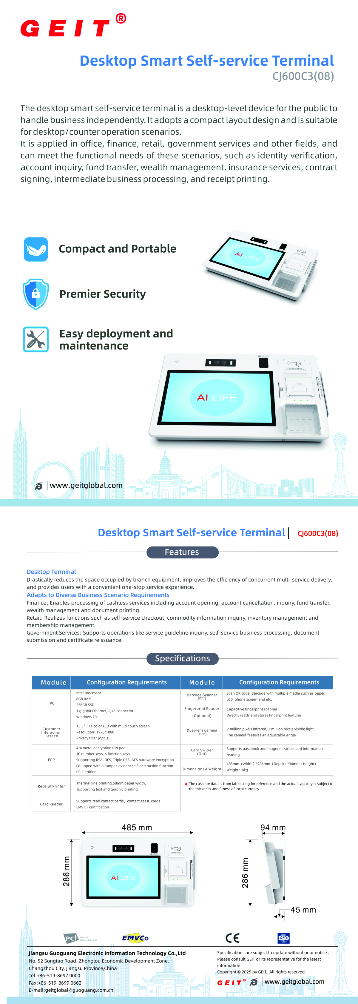 The desktop smart self-service terminal is a desktop-level device for the public to handle business independently. It adopts a compact layout design and is suitable for desktop/counter operation scenarios.