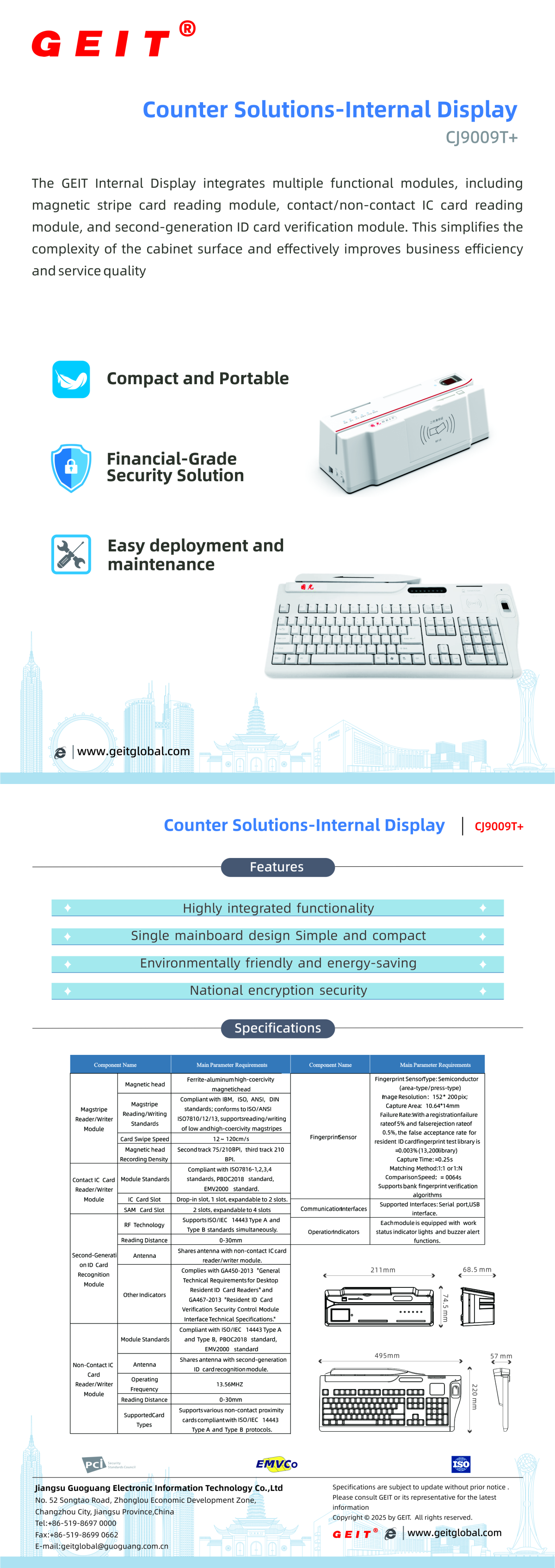 Product DetailsThe GEIT Internal Display integrates multiplefunctional modules, including magnetic stripe card reading module, contact/non-contact IC card reading module, and second-generation ID card verification module. This simplifies the complexit…